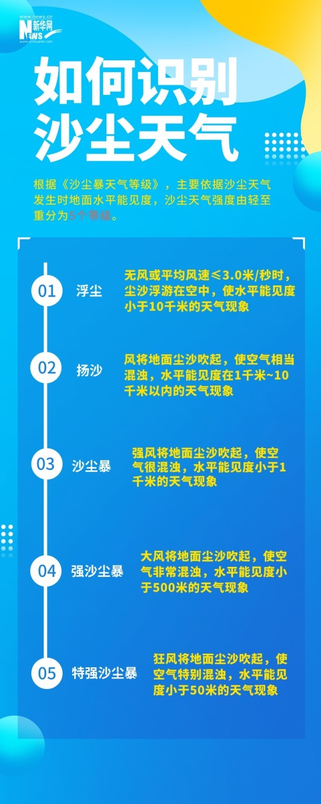 沙塵天氣是指風將地面塵土、沙粒卷入空中,使空氣混濁的天氣現象。根據《沙塵暴天氣等級》,主要依據沙塵天氣發(fā)生時地面水平能見度,沙塵天氣強度由輕至重分為5個等級。