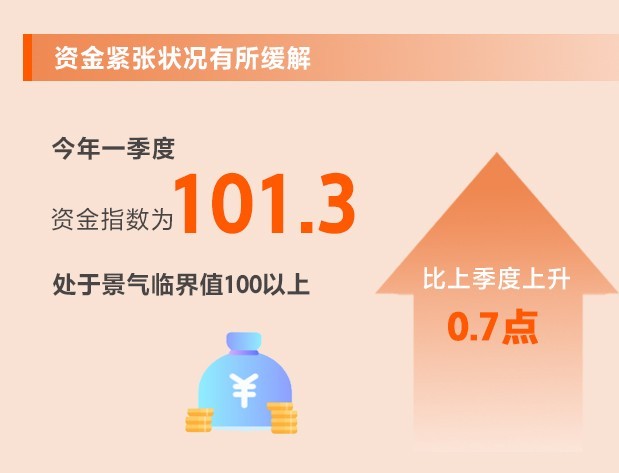 企業生產經營加速恢復,原材料價格漲幅收窄,以及延續優化減稅降費政策減輕企業負擔,小微企業利潤有所改善。一季度,效益指數為74.6,比上季度上升1.6點,反彈幅度較大,但仍處于歷史較低位。所調查的8個行業效益指數均有所上升。