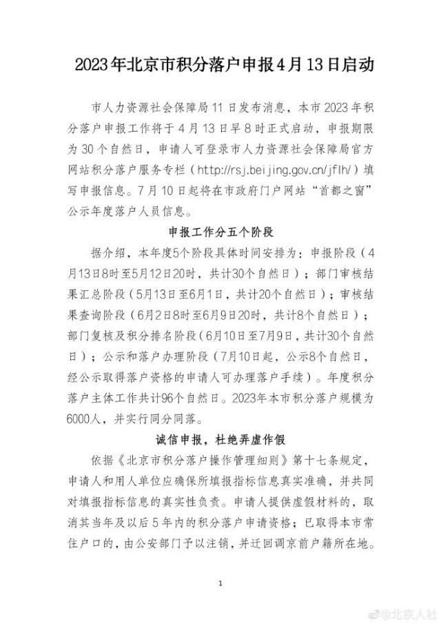 央視網消息:據@北京人社 微博消息,2023年北京市積分落戶申報工作將于4月13日早8時正式啟動。