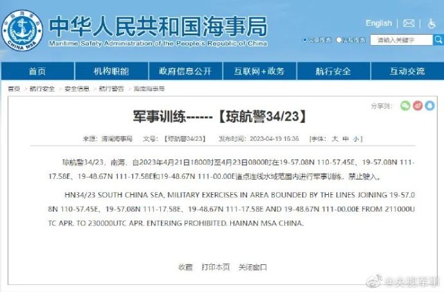 據中國海事局網站消息,清瀾海事局發布航行警告,自4月21日18時至4月23日8時,南海部分海域進行軍事訓練,禁止駛入。