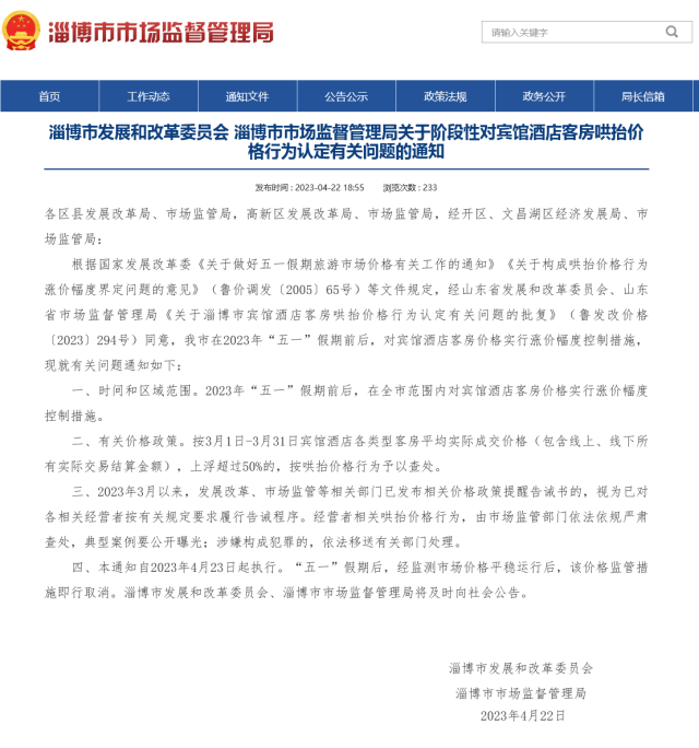 根據(jù)國家發(fā)展改革委《關(guān)于做好五一假期旅游市場價格有關(guān)工作的通知》《關(guān)于構(gòu)成哄抬價格行為漲價幅度界定問題的意見》(魯價調(diào)發(fā)〔2005〕65號)等文件規(guī)定,經(jīng)山東省發(fā)展和改革委員會、山東省市場監(jiān)督管理局《關(guān)于淄博市賓館酒店客房哄抬價格行為認定有關(guān)問題的批復(fù)》(魯發(fā)改價格〔2023〕294號)同意,我市在2023年“五一”假期前后,對賓館酒店客房價格實行漲價幅度控制措施,現(xiàn)就有關(guān)問題通知如下: