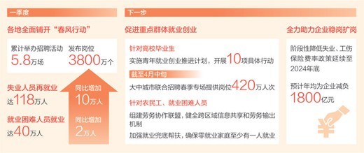 保重點,促進重點群體就業創業。針對高校畢業生,將實施促進高校畢業生等青年就業創業推進計劃,開展10項具體行動,著力拓展就業渠道、做實做細就業服務、強化困難兜底保障。截至4月中旬,大中城市聯合招聘春季專場提供崗位420萬人次。針對農民工、就業困難人員,將組建勞務協作聯盟,健全跨區域信息共享和勞務輸出機制。加強困難群體就業兜底幫扶,確保零就業家庭至少有一人就業。