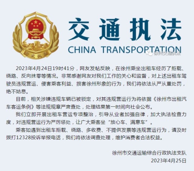 中新網4月25日電 據徐州市交通運輸綜合行政執法支隊微信公眾號消息,2023年4月24日19時41分,網友發帖反映,在徐州乘坐出租車經歷了拒載、繞路、反向抹零等情況。