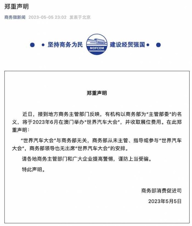 央視網消息:據“商務微新聞”公眾號消息,近日,接到地方商務主管部門反映,有機構以商務部為“主管部委”的名義,將于2023年6月在澳門舉辦“世界汽車大會”,并收取展位費用。在此鄭重聲明:“世界汽車大會”與商務部無關,商務部從未主管、指導或參與“世界汽車大會”,商務部領導也無出席“世界汽車大會”的安排。請各地商務主管部門和廣大企業提高警惕,謹防上當受騙。