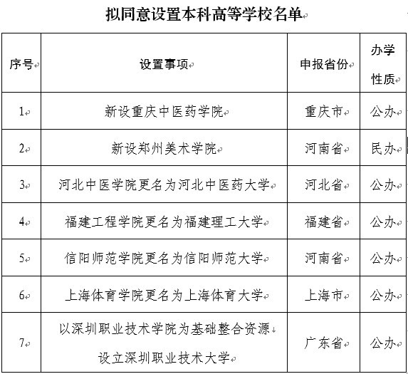 教育部擬同意設置7所本科高等學校(公示名單)