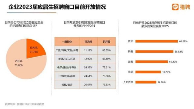 中國青年報客戶端訊(中青報·中青網記者 朱彩云)臨近畢業季,獵聘大數據研究院日前推出的《2023屆高校畢業生就業數據報告》顯示,目前有78.22%的企業仍開放校招窗口,其中廣告/傳媒/文化/教育、能源/化工/環保行業的企業占比分別達88.89%、87.1%。在招崗位中,技術、銷售和運營類需求量位居前三。