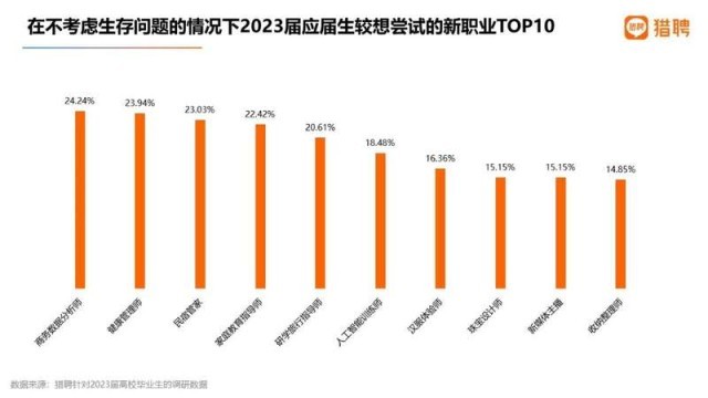 在求職偏好方面,調研顯示,超5成應屆生首份工作期待月薪為5千-1萬元,超6成期待三年后月薪1萬-2萬元。當問及應屆生在不考慮生存問題的情況下較想嘗試哪些新職業?答復中位居前五的是商務數據分析師、健康管理師、民宿管家、家庭教育指導師、研學旅行指導師,得票率均超20%。