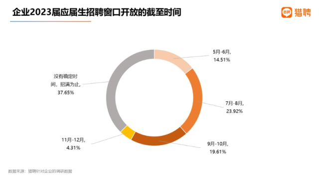 據了解,2023屆高校畢業生規模預計1158萬人,同比增加82萬人。本次調研中,有37.65%的企業表示校招窗口期“沒有確定截止時間,招滿為止”,23.92%的企業表示“最晚到7-8月”,19.61%的企業把期限定為9-10月。