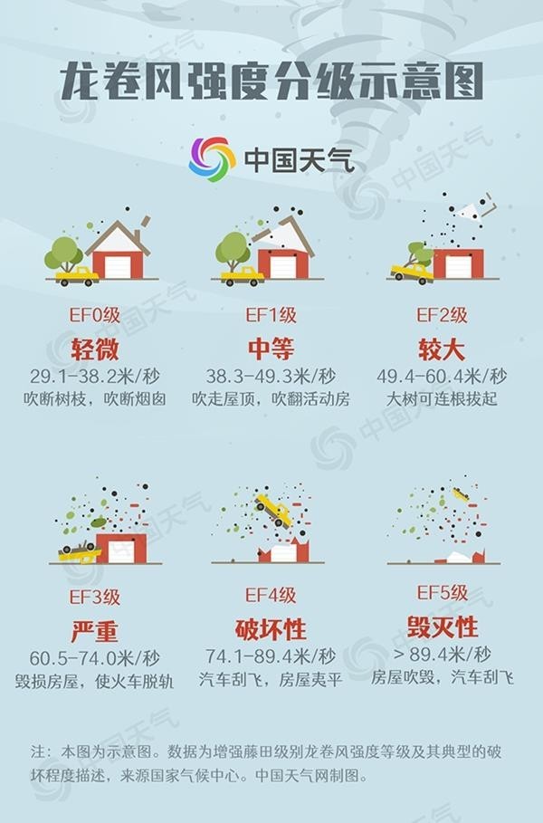 龍卷風(fēng)生成和消失都迅速,常與雷暴、冰雹和暴雨等強(qiáng)對流天氣系統(tǒng)相伴出現(xiàn),破壞力極強(qiáng)。按藤田級數(shù),龍卷強(qiáng)度分為EF0級至EF5級6個等級,EF0級別最低,EF5為最高級別。