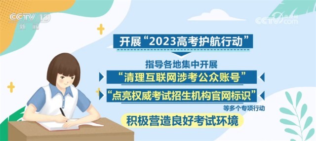 此外,將繼續開展“2023高考護航行動”,指導各地集中開展“清理互聯網涉考公眾賬號”“點亮權威考試招生機構官網標識”等多個專項行動,積極營造良好考試環境。