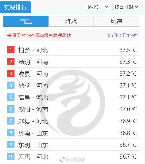 北方本輪高溫天氣持續中。今天11時,全國氣溫實況排行榜前十已沒有36℃以下的身影,河北柏鄉以37.5℃居榜首。你家今天多少度了?注意防暑降溫!