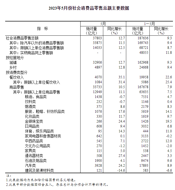 國家統計局公布數據,5月份,社會消費品零售總額37803億元,同比增長12.7%。其中,除汽車以外的消費品零售額33875億元,增長11.5%。