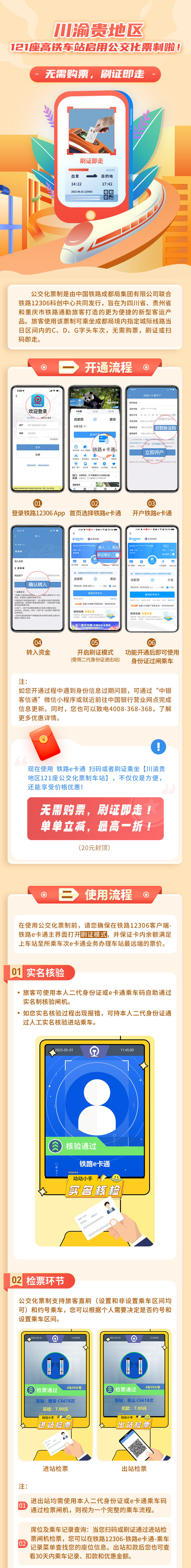 為進一步提升通勤旅客出行體驗,中國鐵路成都局集團有限公司管內的川渝貴地區121座高鐵車站啟用公交化票制。已開通鐵路e卡通的旅客在鐵路12306客戶端-鐵路e卡通主頁,啟用刷證模式,即可使用二代身份證或e卡通乘車碼,實現無需購票,刷證或掃碼即走。