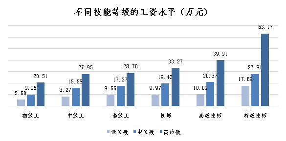 從工資中位數看,首席技師工資超初級工3倍。首席技師、特級技師、高級技師、技師、高級工、中級工和初級工分別為30.33萬元、27.91萬元、20.87萬元、19.43萬元、17.37萬元、15.58萬元和9.95萬元。