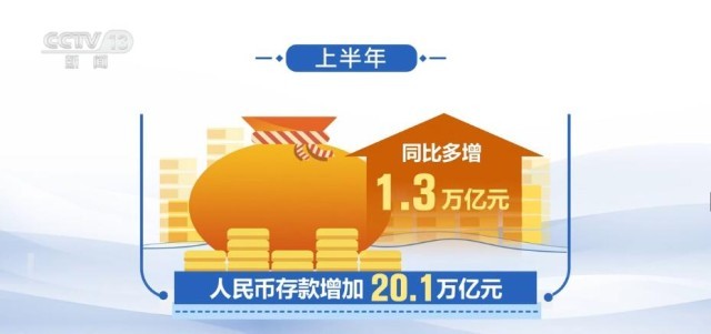 此外,數據顯示,上半年人民幣存款增加20.1萬億元,同比多增1.3萬億元。