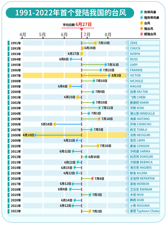 從統計數據可以看出,雖然今年初臺登陸我國時間明顯偏晚,但并不具有極端性。常年氣候平均監測顯示(1991-2020年),首個登陸我國(包含港澳臺)的臺風平均日期為6月27日,發生最多月份為6月(14個),其次為7月(13個),最早的首個登陸臺風為2008年的1號臺風浣熊(0801),登陸時間為4月18日,登陸地點在海南文昌。1997年臺風“VICTOR”于8月2日登陸香港,是1991年以來最晚登陸我國的初臺。