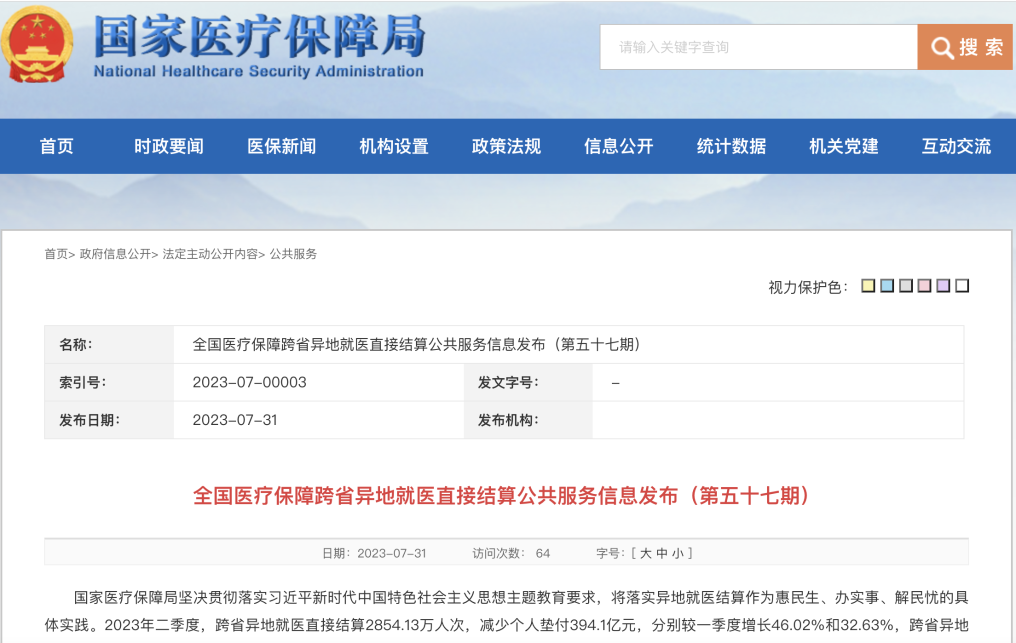 此外,住院費(fèi)用跨省直接結(jié)算規(guī)模進(jìn)一步增長(zhǎng)。截至2023年二季度末,全國(guó)住院費(fèi)用跨省聯(lián)網(wǎng)定點(diǎn)醫(yī)療機(jī)構(gòu)達(dá)7.44萬(wàn)家,較一季度末增長(zhǎng)0.69萬(wàn)家。2023年二季度,住院費(fèi)用跨省直接結(jié)算282.57萬(wàn)人次。