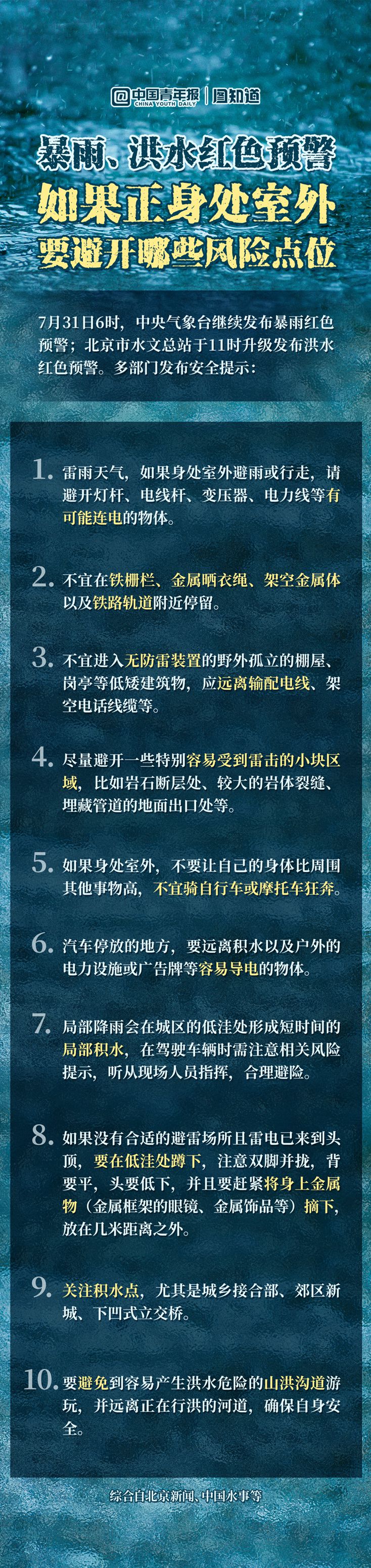7月31日6時,中央氣象臺繼續(xù)發(fā)布暴雨紅色預(yù)警。北京市水文總站于當日11時升級發(fā)布洪水紅色預(yù)警。如果遇到暴雨、洪水時恰好身處室外,應(yīng)避開哪些風險點位?學(xué)習(xí)科普知識,安全度汛。