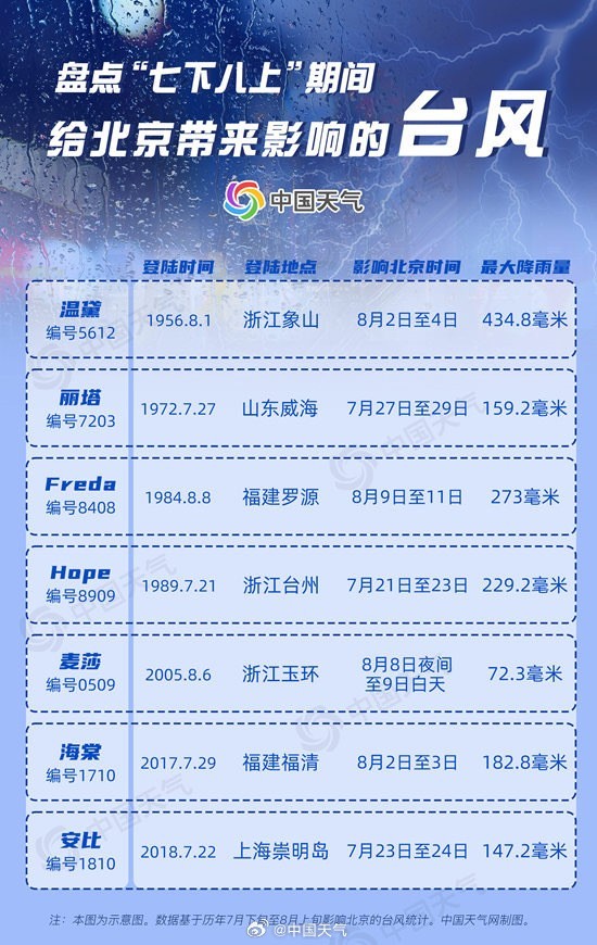 本次極端降水過程中,臺風(fēng)“杜蘇芮”的殘余環(huán)流北上是其中一個(gè)重要的原因。歷史上北京也曾多次受到臺風(fēng)及其減弱后的低壓影響,出現(xiàn)較強(qiáng)降雨。例如2017年第10號臺風(fēng)“海棠”和2018年第10號臺風(fēng)“安比”給北京帶來的最大降雨量都超過了100毫米,更早的1956年第12號臺風(fēng)“溫黛”導(dǎo)致的最大降雨量更是超過400毫米。