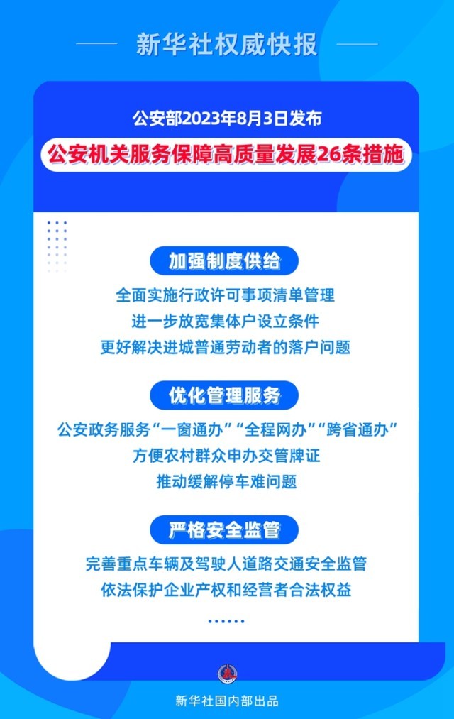 在優化管理服務方面,推出一批促進高質量發展的服務舉措:方便農村群眾申辦交管牌證,提高道路資源利用率,便利交通物流貨運車輛通行,進一步促進汽車消費,實行公安政務服務“一窗通辦”,持續推進公安政務服務“全程網辦”,全面實施“跨省通辦”,實施“免交證、辦成事”改革,試點證件照片“一拍共享、一照通用”,大力推進公安政務服務進社區、進農村,為船舶和人員出海報備提供便利。