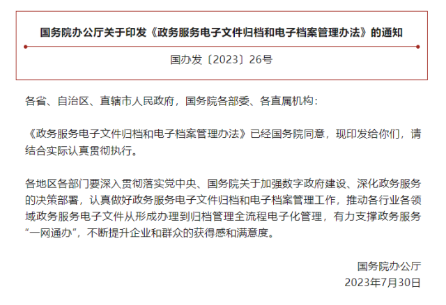 《辦法》就進一步規范政務服務電子文件歸檔和電子檔案管理,推動各行業各領域政務服務電子文件從形成辦理到歸檔管理全流程電子化,在機制和流程上提出明確要求,將有力支撐政務服務“一網通辦”。