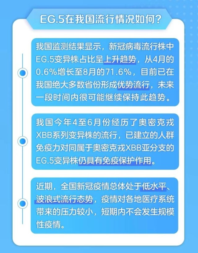 部分公眾關心EG.5是否會引發新一輪的廣泛流行。對此,國家疾控局表示,我國今年4至6月份經歷了奧密克戎XBB系列變異株的流行,已建立的人群免疫力對同屬于奧密克戎XBB亞分支的EG.5變異株仍具有免疫保護作用,短期內不會發生規模性疫情。
