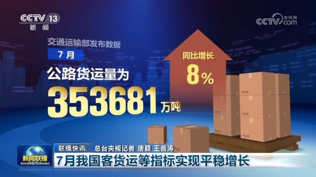 353681萬噸。交通運輸部發布數據,7月,公路貨運量為353681萬噸,同比增長8%;水路貨運量為78964萬噸,同比增長6.9%。客運方面,7月公路客運量為40798萬人,同比增長19.3%;水路客運量為3034萬人,同比增長78.3%。