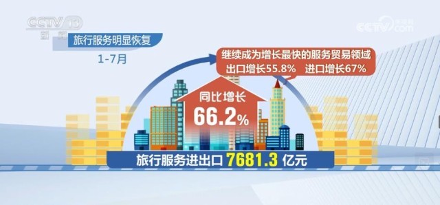 旅行服務明顯恢復。1月—7月,旅行服務進出口7681.3億元,同比增長66.2%,繼續成為增長最快的服務貿易領域。其中,出口增長55.8%、進口增長67%。