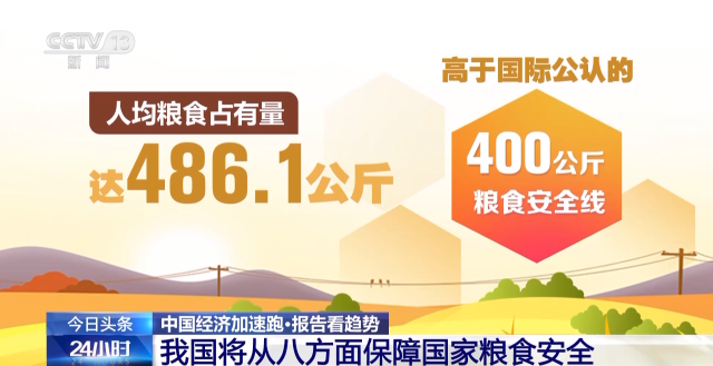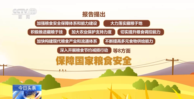 報告提出,將從加強糧食安全保障體系和能力建設、大力落實藏糧于地、積極推進藏糧于技、加大農業保護支持力度、切實提升糧食調控能力、加快構建現代糧食產業和流通體系、不斷提高多元食物供給能力、深入開展糧食節約減損行動等8方面,保障國家糧食安全。