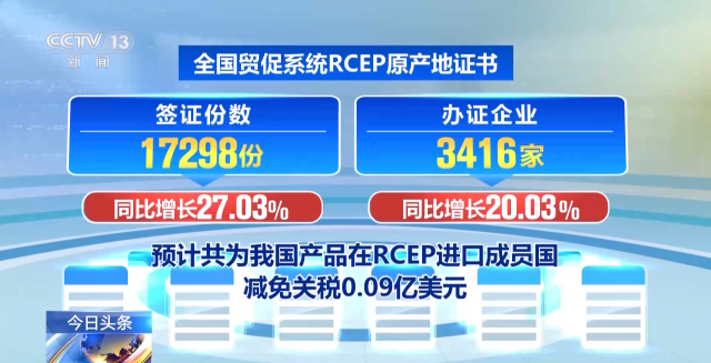 中國貿促會8月30日介紹:今年7月份,全國貿促系統累計簽發原產地證書等各類證書54.62萬份,較上年同比增長12.82%。全國貿促系統RCEP原產地證書簽證份數為17298份,同比增長27.03%;辦證企業3416家,同比增長20.03%,預計共為我國產品在RCEP進口成員國減免關稅0.09億美元。