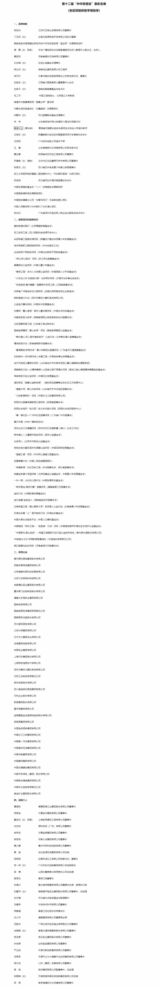 民政部發布第十二屆“中華慈善獎”表彰名單