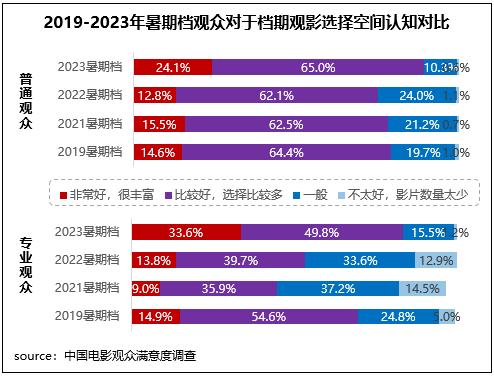 2023年7-8月新上映影片共80部,為近四年來(lái)同期最高值,滿意度調(diào)查的13部影片涵蓋劇情、動(dòng)畫(huà)、奇幻、懸疑、愛(ài)情、喜劇、動(dòng)作等多元類型,給觀眾帶來(lái)多樣化的觀影選擇。調(diào)研數(shù)據(jù)顯示,不同觀眾對(duì)于檔期觀影選擇空間均給予了好評(píng),普通觀眾、專業(yè)觀眾認(rèn)為檔期觀影選擇“非常好,很豐富”和“比較好,選擇比較多”的占比合計(jì)分別達(dá)89.2%、83.4%,均為近五年同期最高。