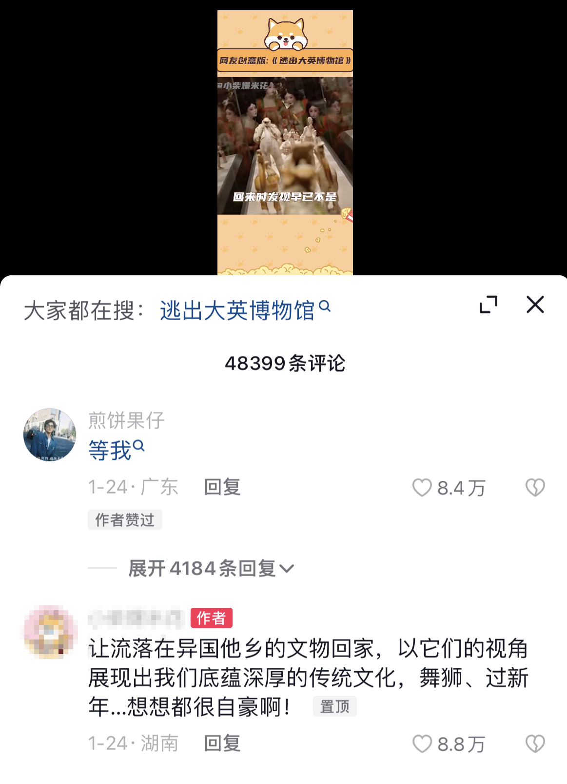 這仿佛巧合般的存在,實則藏著一條文化接力的暗線。2023年初,一名網友自制短視頻,提出了《逃出大英博物館》的創意想法:“讓流落在異國他鄉的文物回家,以它們的視角展現出我們底蘊深厚的傳統文化。”刷到視頻的煎餅果仔在評論區留下了兩個字“等我”。