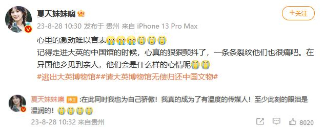 預告片發布后,up主“夏天妹妹噢”難掩激動之情,她清楚地記得自己走進大英博物館的中國館時,心真的狠狠顫抖了。“一條條裂紋他們也很痛吧,在異國他鄉見到親人,他們會是什么樣的心情呢?”同時,她也為自己真正成為了有溫度的傳媒人而驕傲。