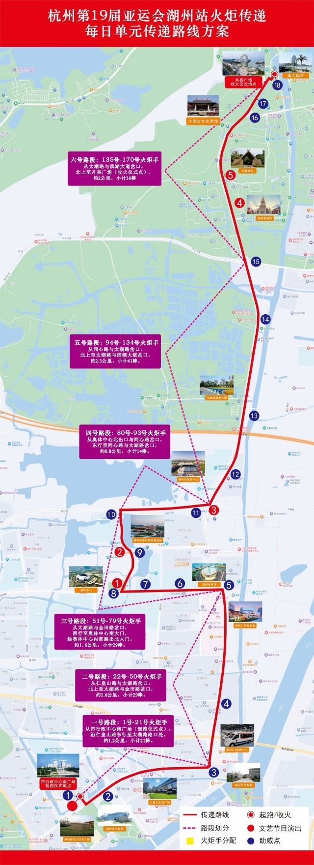 本次傳遞以“在湖州看見美麗中國”為主題,傳遞路線從湖州市行政中心南廣場出發,沿仁皇山路—太湖路—金田路—奧體中心—同心路—太湖路進行傳遞,最后到達南太湖月亮廣場,舉行收火儀式。