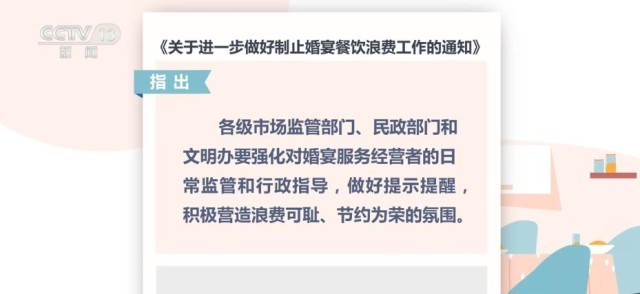 央視網(wǎng)消息:市場(chǎng)監(jiān)管總局、民政部和中央文明辦近日聯(lián)合印發(fā)《通知》,通過(guò)強(qiáng)化部門聯(lián)動(dòng),推進(jìn)制止婚宴餐飲浪費(fèi)工作。