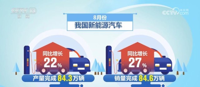中國汽車工業協會的數據顯示,8月份,我國新能源汽車產銷量分別完成84.3萬輛和84.6萬輛,同比分別增長22%和27%,市場占有率達到32.8%。1月—8月,新能源汽車產銷分別完成543.4萬輛和537.4萬輛,同比分別增長36.9%和39.2%。