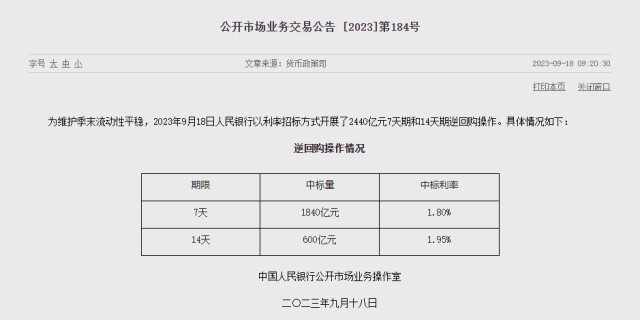 央視網消息:中國人民銀行發布公告,為維護季末流動性平穩,9月18日以利率招標方式開展2440億元7天期和14天期逆回購操作。