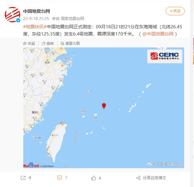 中國地震臺網正式測定:09月18日21時21分在東海海域(北緯26.45度,東經125.35度)發生6.4級地震,震源深度170千米。