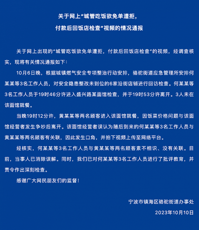 網傳“城管吃飯欲免單遭拒后回飯店檢查”,官方通報