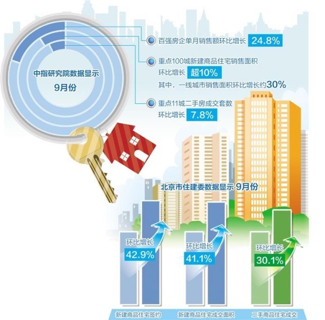 隨著需求釋放動能減弱,9月后兩周成交量明顯下降。北京市住建委數據顯示,9月份,北京新建商品住宅簽約5891套,成交面積67.96萬平方米,環比分別增長42.9%和41.1%;二手商品住宅成交14262套,環比增長30.1%。
