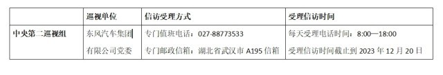 日前,二十屆中央第二輪巡視的15個巡視組陸續進駐被巡視單位黨組織開展巡視工作。截至目前,中央巡視組已進駐東風汽車集團有限公司,并公布了信訪聯系方式。