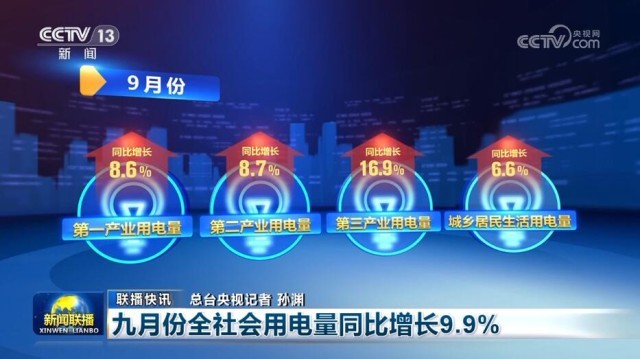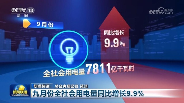 央視網消息:據今天(10月16日)國家能源局公布的最新消息,9月份全社會用電量同比增長9.9%,不斷攀升的電力數據從側面反映出國民經濟活力充沛。另外,我國在金融證券管理、能源開發、交通基建等多個領域發展勢頭良好,各類展會運行順暢、亮點紛呈。