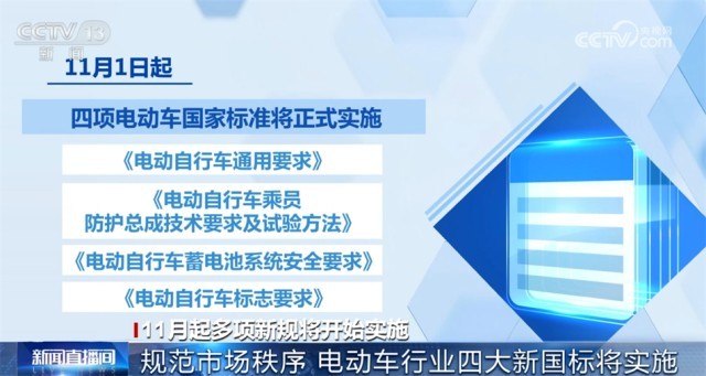 11月1日起,四項(xiàng)電動(dòng)車國家標(biāo)準(zhǔn)將正式實(shí)施,分別是《電動(dòng)自行車通用要求》《電動(dòng)自行車乘員防護(hù)總成技術(shù)要求及試驗(yàn)方法》《電動(dòng)自行車蓄電池系統(tǒng)安全要求》以及《電動(dòng)自行車標(biāo)志要求》。這些標(biāo)準(zhǔn)對電動(dòng)車的設(shè)計(jì)制造、安全性能、電池系統(tǒng)和標(biāo)識(shí)等方面都提出了明確規(guī)定,涉及電動(dòng)車的車把、鋰電池、總線設(shè)計(jì)、電子控制系統(tǒng)等。