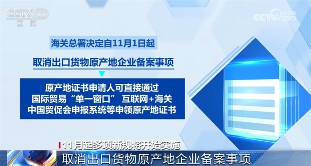 海關(guān)總署決定自11月1日起,取消出口貨物原產(chǎn)地企業(yè)備案事項(xiàng),原產(chǎn)地證書申請人可直接通過國際貿(mào)易“單一窗口”“互聯(lián)網(wǎng)+海關(guān)”、中國貿(mào)促會(huì)申報(bào)系統(tǒng)等申領(lǐng)原產(chǎn)地證書,進(jìn)一步優(yōu)化跨境貿(mào)易營商環(huán)境,提升貿(mào)易便利。