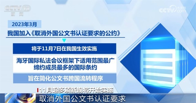 今年3月,我國加入《取消外國公文書認(rèn)證要求的公約》,《公約》將于11月7日在我國生效實(shí)施。《公約》是海牙國際私法會(huì)議框架下適用范圍最廣、締約成員最多的國際條約,旨在簡化公文書跨國流轉(zhuǎn)程序。11月7日起,中國送往其他締約國使用的公文書僅需辦理《公約》規(guī)定的附加證明書,即可送其他締約國使用,無需辦理中國和締約國駐華使領(lǐng)館的領(lǐng)事認(rèn)證。其他締約國公文書送中國內(nèi)地使用,只需辦理該國附加證明書,無需辦理該國和中國駐當(dāng)?shù)厥诡I(lǐng)館的領(lǐng)事認(rèn)證。