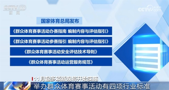 國家體育總局發(fā)布的《群眾體育賽事活動(dòng)辦賽指南 編制內(nèi)容與評(píng)估指引》《群眾體育賽事活動(dòng)參賽指引 編制內(nèi)容與評(píng)估指引》《群眾體育賽事活動(dòng)安全評(píng)估技術(shù)導(dǎo)則》《群眾體育賽事活動(dòng)運(yùn)營服務(wù)規(guī)范》四項(xiàng)體育行業(yè)標(biāo)準(zhǔn)自11月1日起實(shí)施。這些標(biāo)準(zhǔn)明確了群眾體育賽事活動(dòng)安全評(píng)估的流程、策劃、實(shí)施和總結(jié),運(yùn)營服務(wù)的基本要求、服務(wù)要求、管理要求等內(nèi)容,適用于各級(jí)各類群眾體育賽事活動(dòng)的舉辦。