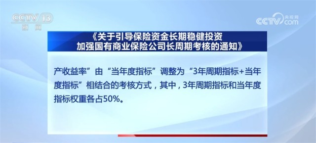 《通知》明確,為引導國有商業保險公司長期穩健經營,更好發揮中長期資金的市場穩定器和經濟發展助推器作用,加強對國有商業保險公司的長周期考核,根據《財政部關于印發<商業保險公司績效評價辦法>的通知》,將經營效益指標的“凈資產收益率”由“當年度指標”調整為“3年周期指標+當年度指標”相結合的考核方式,其中,3年周期指標和當年度指標權重各占50%。