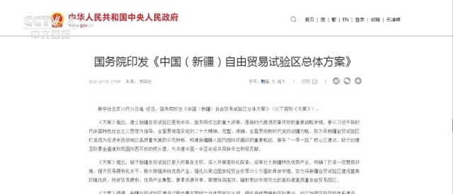 央視網消息:昨天(10月31日),國務院印發《中國(新疆)自由貿易試驗區總體方案》,提出賦予新疆自貿試驗區更大改革自主權,深入開展差別化探索,培育壯大新疆特色優勢產業等政策,明確了提升貿易便利化水平、強化與周邊國家經貿合作等25個方面的具體舉措。自2013年中國首個自貿試驗區在上海掛牌,此次新設新疆自貿試驗區已經是自貿試驗區第七次擴容。