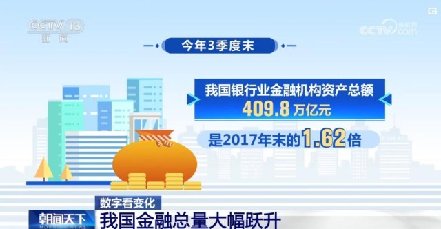 最新數據顯示,今年3季度末,我國銀行業金融機構資產總額為409.8萬億元,是2017年末的1.62倍。銀行業金融機構本外幣貸款余額239.5萬億元,是2017年末的1.91倍。本外幣存款余額286.6萬億元,是2017年末的1.69倍。保險方面,3季度末,保險公司總資產29.6萬億元,是2017年末的1.77倍。從2018年到今年3季度末,保險公司賠款與給付累計支出8.4萬億元,保險的保障功能日益突出。